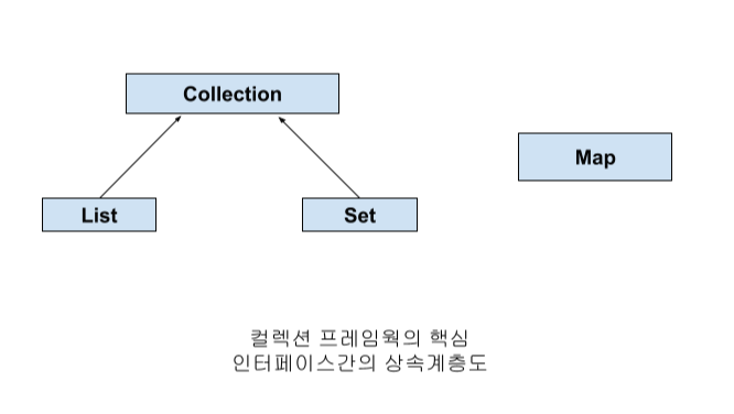 인터페이스 List와 Set을 구현한 컬렉션 클래스들은 서로 많은 공통부분이 있어서 공통된 부분을 다시 뽑아 Collection인터페이스를 정의할 수 있다. Map인터페이스는 다른 형태로 컬렉션을 다루기 때문에 같은 상속계층도에 포함되지 못했다.