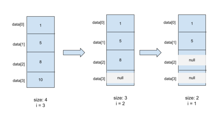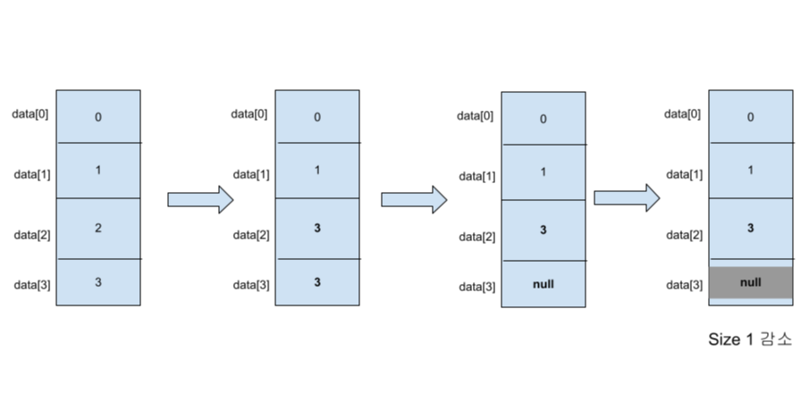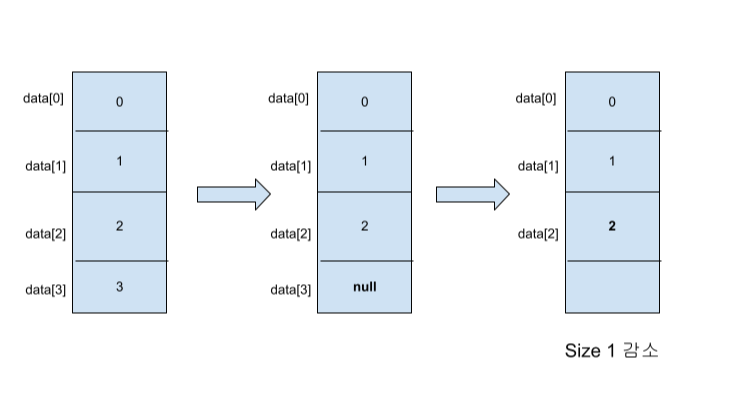 ArrayList의 요소를 삭제하는 경우, 삭제할 객체의 바로 아래에 있는 데이터를 한 칸씩 위로 복사해서 삭제할 객체를 덮어쓰는 방식으로 처리한다. 만일 삭제할 객체가 마지막 데이터라면, 복사할 필요 없이 단순히 null로 변경해주기만 하면 된다.