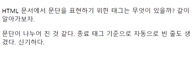 paragraph으로 나눌 수 있는 <p> 태그는 문단을 표현하기 위한 태그이다. </p> 종료 태그 다음에는 자동으로 빈 줄이 생긴다.