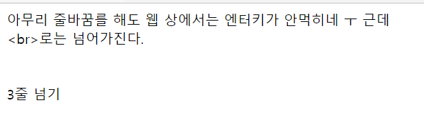 HTML 코드는 <Enter> 키를 여러 개 입력해도 웹 상에서 다음 줄로 넘어가지 않는다. 새로운 줄로 넘어가 출력시키고 싶으면 <br> 태그를 사용하면 된다.