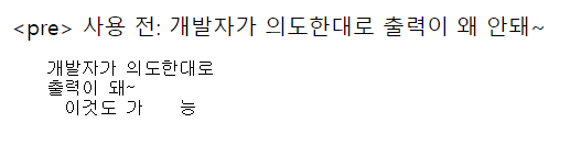 브라우저는 개발자가 HTML 문서의 모양을 포맷하기 위해 삽입한 여러 개의 빈칸이나 탭 줄바꿈을 모두 하나의 빈칸으로만 처리한다. 개발자가 의도한 모양대로 출력하기 위해서는 <pre> 태그를 사용하면 된다.
