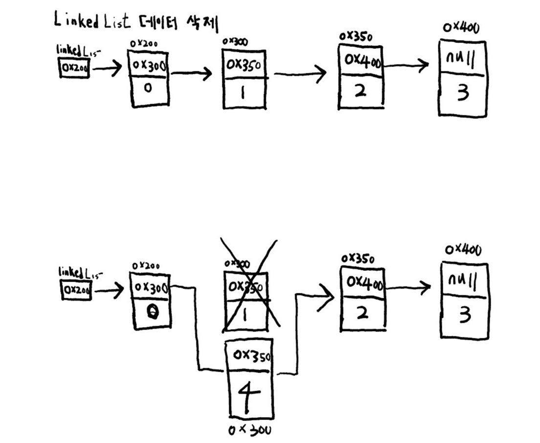 Linked List에서 데이터 삭제는 간단하다. 삭제하고자 하는 요소의 이전 요소를 삭제하고자 하는 요소의 다음 요소를 참조하도록 바꿔주기만 하면 된다. 단 하나의 참조만 변경하면 삭제는 쉽게 할 수 있다.