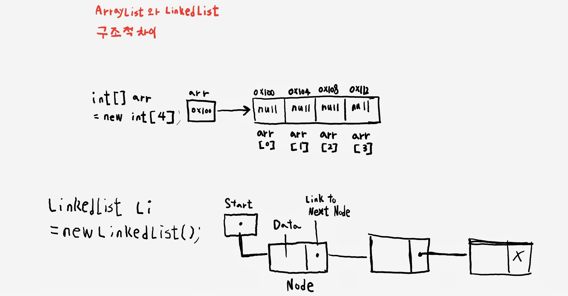 밑에 그림은 위에 arr은 Array 밑에는 LinkedList이다. ArrayList는 그림과 같이 요소들이 연속적으로 존재한다. 메모리에서도 요소들이 연속적으로 존재하기 때문에 간단한 계산만으로 요소의 주소 값을 쉽게 얻을 수 있다.