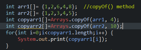 위 코드는 1,3,5,6,7번째 줄만 주의 깊게 보자. 3번째 줄 copyarr1 []는 Arrays.copyOf(arr1,4); 즉, arr1 배열에서 요소 4개를 복사해 온다는 소리이다. 그래서 출력으로 1,2,6,4 4개만 출력된 것을 확인할 수 있다.