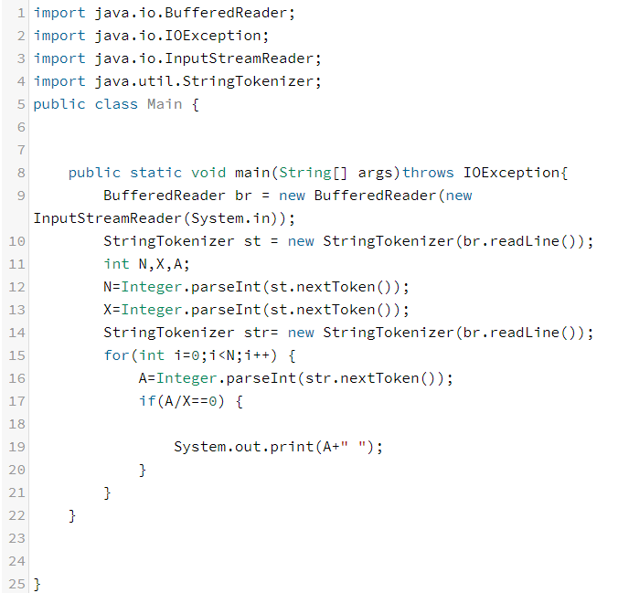 첫째 줄에 N과 X가 주어진다. (1 ≤ N, X ≤ 10,000) 둘째 줄에 수열 A를 이루는 정수 N개가 주어진다. 주어지는 정수는 모두 1보다 크거나 같고, 10,000보다 작거나 같은 정수이다.