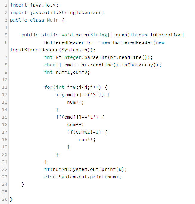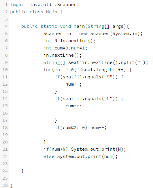 극장의 한 줄의 정보가 주어진다. 이때, 이 줄에 사람들이 모두 앉았을 때, 컵홀더에 컵을 꽂을 수 있는 최대 사람의 수를 구하는 프로그램을 작성하시오. 모든 사람은 컵을 한 개만 들고 있고, 자신의 좌석의 양 옆에 있는 컵홀더에만 컵을 꽂을 수 있다.