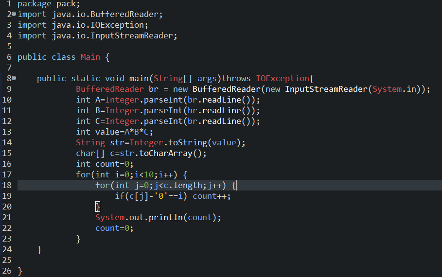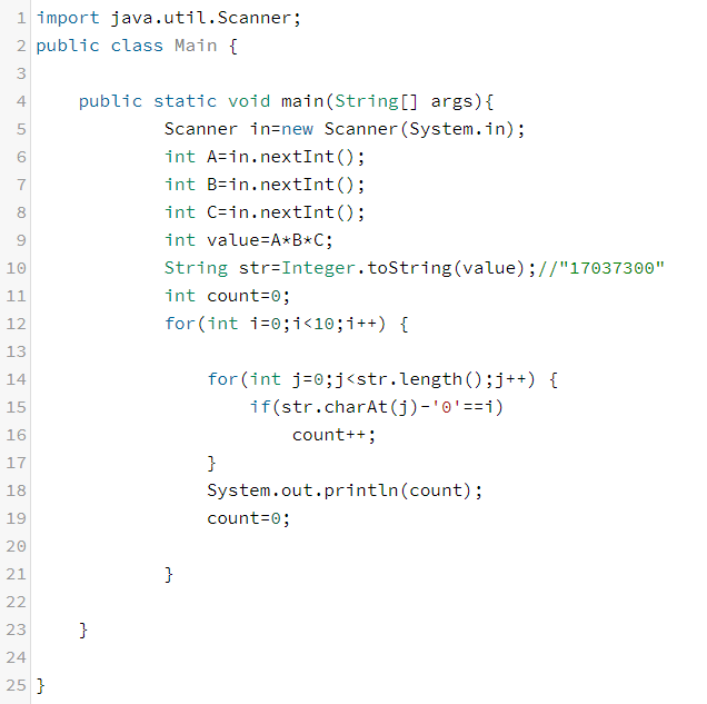 첫째 줄에는 A × B × C의 결과에 0 이 몇 번 쓰였는지 출력한다. 마찬가지로 둘째 줄부터 열 번째 줄까지 A × B × C의 결과에 1부터 9까지의 숫자가 각각 몇 번 쓰였는지 차례로 한 줄에 하나씩 출력한다.