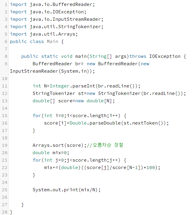 - 20~23줄: mix 더블 타입에 변수를 선언과 동시에 0으로 초기화 반복문으로 문제에 조건에 따라 현재( index의 점수/최고 점수*100)를 한다 mix는 이렇게 계산된 점수들을 총합할 것이다. 참고로 22줄 score [N-1]을 한 이유는 현재 score의 배열은 오름차순으로 정렬되었기 때문에 최고값은 N-1의 index값을 가지고 있는다.