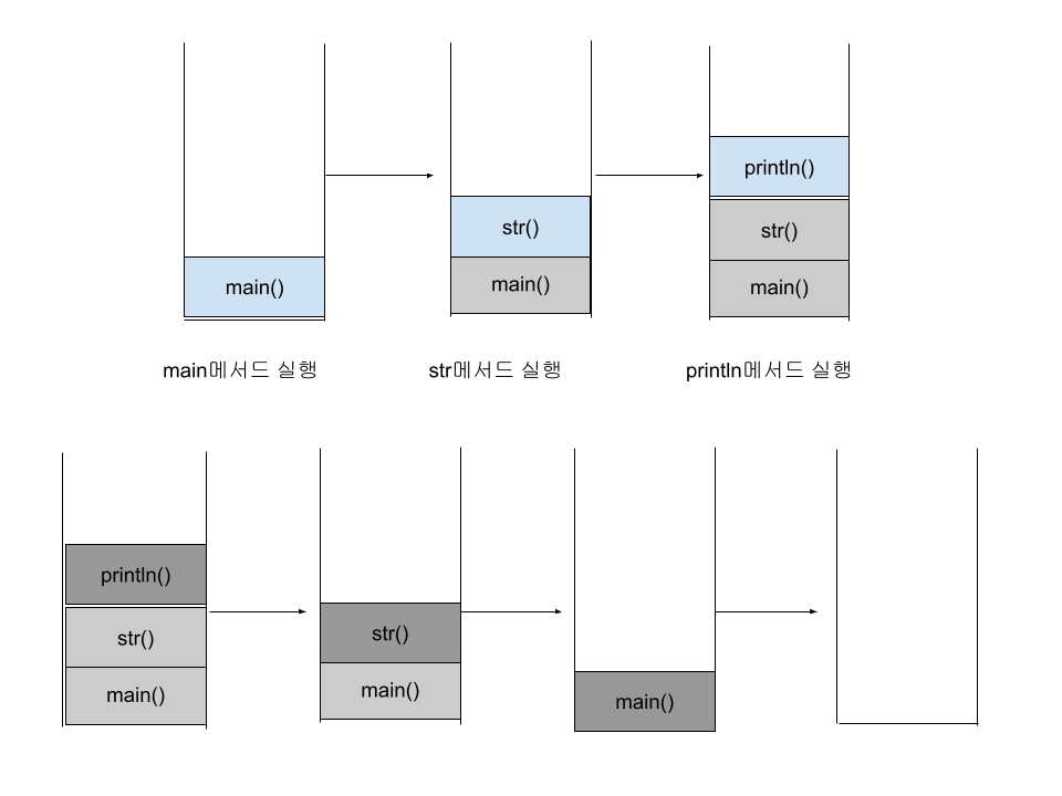 메서드가 수행을 마치면 사용했던 메모리를 반환. (수행을 마친 메서드는 스택에서 삭제)